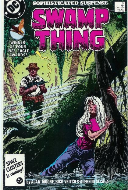 Old friends return to haunt Abby! Another chiller from Alan Moore, with art by Rick Veitch and Alfredo Alcala. Cover by Stephen Bissette. Swamp Thing - the series that won four 1985 Eagle Awards! Cover price $0.75.