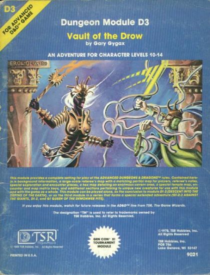 "This module contains background information, a large-scale referee's map with a matching partial map for players, referee's notes, special exploration and encounter pieces, a hex map detailing an enormous cavern area, a special temple map, encounter and map matrix keys, and additional sections pertaining to unique new creatures for use with this module and the game as a whole. A complete setting for play of ADVANCED DUNGEONS & DRAGONS is contained herein. This module can be played alone, as the final part of a series of three modules (with DESCENT INTO THE DEPTHS OF THE EARTH, D1 and SHRINE OF THE KUO-TOA, D2.), or as the sixth part of a continuing series of modules which form a special campaign scenario (DUNGEON MODULES G1, G2, G3, D1, D2, D3, and Q1, QUEEN OF THE DEMONWEB PITS, soon to be released)."