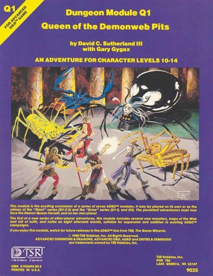 "An Adventure for Character Levels 10-14 by David C. Sutherland III with Gary Gygax." Front cover: "This module is the exciting conclusion of a series of seven AD&D (TM) modules. It may be played on its own or as the climax of the "Giant" series (G1, G2 and G3) and the "Drow series (D1, D2 and D3). The persistent adventurer must now face the Demon Queen herself, on on her own plane! "The first of a new series of other-planar adventures, this module includes several new monsters, maps of the Web and lair of Lolth, and notes on eight alternative worlds, suitable for expansion and addition to existing AD&D campaigns."