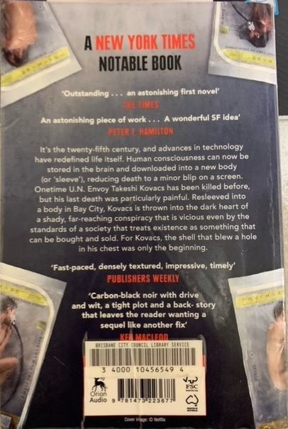 In the twenty-fifth century, humankind has spread throughout the galaxy, monitored by the watchful eye of the U.N. While divisions in race, religion, and class still exist, advances in technology have redefined life itself. Now, assuming one can afford the expensive procedure, a person’s consciousness can be stored in a cortical stack at the base of the brain and easily downloaded into a new body (or “sleeve”) making death nothing more than a minor blip on a screen. Ex-U.N. envoy Takeshi Kovacs has been killed before, but his last death was particularly painful. Dispatched one hundred eighty light-years from home, re-sleeved into a body in Bay City (formerly San Francisco, now with a rusted, dilapidated Golden Gate Bridge), Kovacs is thrown into the dark heart of a shady, far-reaching conspiracy that is vicious even by the standards of a society that treats “existence” as something that can be bought and sold. For Kovacs, the shell that blew a hole in his chest was only the beginning. . . . From the Trade Paperback edition.