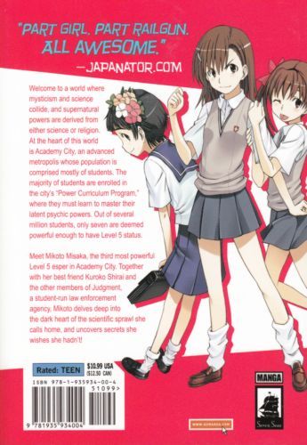 Soon to be a hit anime from FUNimation!Welcome to a world where mysticism and science collide, and supernatural powers are derived from either science or religion. At the heart of this world is Academy City, an advanced metropolis whose population is comprised mostly of students. The majority of students are enrolled in the city’s "Power Curriculum Program," where they must learn to master their latent psychic powers. Out of several million students, only seven are deemed powerful enough to have Level 5 status.Meet Mikoto Misaka, the third most powerful Level 5 esper in Academy City. Together with her best friend Kuroko Shirai and the other members of Judgment, a student-run law enforcement agency, Mikoto delves deep into the dark heart of the scientific sprawl she calls home, and uncovers secrets she wishes she hadn’t!A Certain Scientific Railgun is a must-have manga series for fans of stories that blend science and magic like Psychic Academy and Full Metal Alchemist.