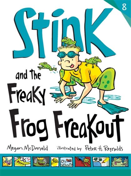 Croak! Squeenk! Ribbet! After a close encounter with a mutant amphibian makes him freaky for frogs, water-shy Stink becomes a swimming success.Stink may be super smart, and Stink may be uber clever, but he's been in the Polliwog swim class frog-ever and he still can't bear to put his face in the water. Why would he want a geyser up his nose, on purpose? But then something weird happens: Stink starts to see frogs everywhere — in the locker room, in his boot, in the bathtub. And when a freaky blue frog licks his arm, his froggy senses start tingling! He has an urge to slurp up raisins (that look like flies). He can't wait to play in the rain and mud. He's a wiz at identifying frog calls. And he has become very interested in the local frog population. Could it be that Stink is turning into . . . the amazing Stink-Frog, fighter of slime? Pree-eep! Craw-awk!
