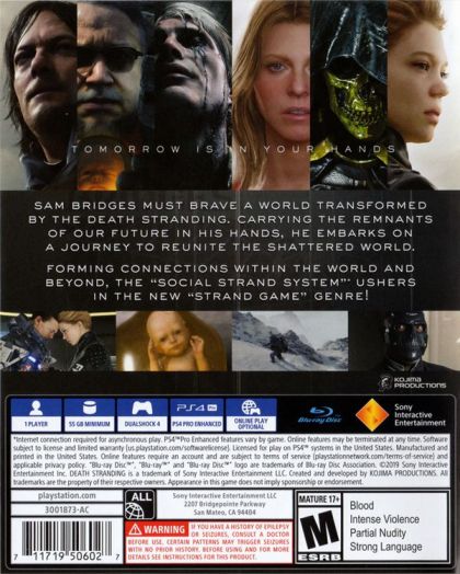From legendary game creator Hideo Kojima comes an all-new, genre-defying experience for PlayStation 4. Sam Bridges must brave a world utterly transformed by the Death Stranding. Carrying the disconnected remnants of our future in his hands, he embarks on a journey to reconnect the shattered world one step at a time. With spectral creatures plaguing the landscape, and humanity on the verge of a mass extinction, it's up to Sam to journey across the ravaged continent and save mankind from impending annihilation. What is the mystery of the Death Stranding? What will Sam discover on the road ahead? An unprecedented gameplay experience holds these answers and more.