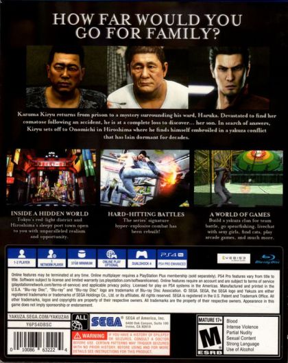 In Yakuza 6, Kazuma Kiryu will find out exactly how much people are willing to sacrifice for family - be those ties through blood or bond - when he investigates a series of shadowy events that involve the ones he holds closest to his heart. Fresh out of a three-year prison sentence, an older and weathered Kiryu comes to find out that his surrogate daughter, Haruka, has gone missing from the orphanage he looks after. The trail leads him to his old stomping grounds in Kamurocho, where he discovers that she has been struck by a car and now lies in a coma. To make matters worse, Kiryu learns that Haruka now has a son that he must look after. With baby in hand, Kiryu journeys to the seaside town of Onomichi, Hiroshima to unravel the truth about Haruka, her son, and a sinister secret that the Hiroshima yakuza are harboring.