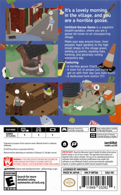 Untitled Goose Game is a slapstick-stealth-sandbox, where you are a goose let loose on an unsuspecting village. Make your way around town, from peoples' back gardens to the high street shops to the village green, setting up pranks, stealing hats, honking a lot, and generally ruining everyone's day.