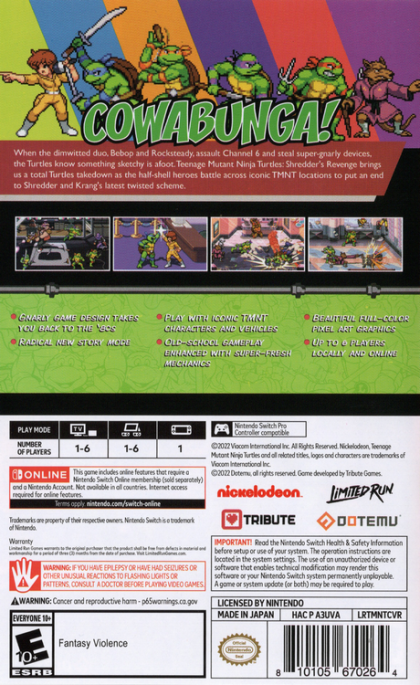 Teenage Mutant Ninja Turtles: Shredder's Revenge features groundbreaking gameplay rooted in timeless classic brawling mechanics, brought to you by the beat 'em up experts at Dotemu (Streets of Rage 4) and Tribute Games. Bash your way through gorgeous pixel art environments and slay tons of hellacious enemies with your favorite Turtle, each with his own skills and moves - making each run unique!