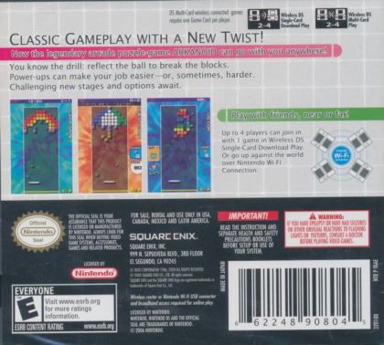 ARKANOID DS updates the classic block-busting gameplay of the 1986 original, with the Vaus vessel, balls and bricks all still intact. Different modes of play provide unique challenges including Clear with 140 levels to complete and Quest mode that sets different rules for clearing each round. Points won in the game can be used to customize the game further, with new backgrounds, blocks and sound effects waiting to be unlocked.