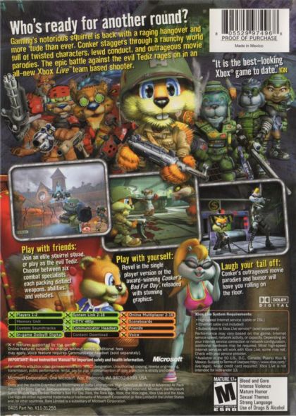 Also included is the critically acclaimed single-player game "Conker's Bad Fur Day(r)," completely recreated for Xbox with stunning graphics and unparalleled attitude.