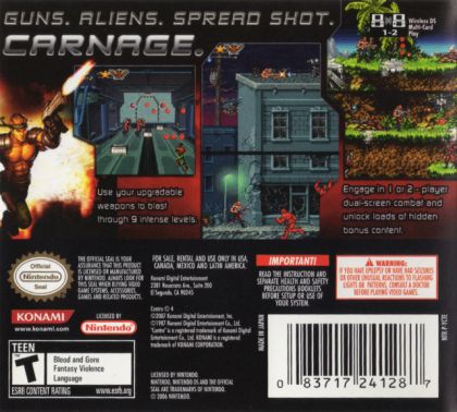 The action franchise that started it all is celebrating its 20th anniversary with an all-new adventure on Nintendo DS! Set after the events of Contra III: Alien Wars, the game follows mercenaries Bill Rizer and Lance Bean as they battle to save the world from a new extraterrestrial threat. Contra 4 takes advantage of the dual screens of the Nintendo DS to deliver larger than life action, with massive enemies, detailed platform gaming and mind-blowing set pieces. Using a variety of upgradable weapons, take the fight to the alien army of the Black Viper and reclaim Earth for mankind in single-player action or 2-player co-op mode.