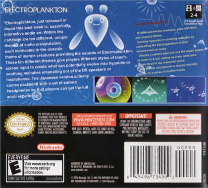 In Electroplankton, art and music collide to create a wildly fresh interactive audio experience. Players will encounter 10 unique species that respond to their touch and voice to create unforgettable sounds and melodies. Interacting with this wide and wild variety of Electroplankton is as simple as sliding the stylus across the touch screen. Toy with Tracy plankton and listen to their music as they swim along drawn lines. Players clap their hands or use their voices to lead a microscopic synchronized swimming team of Nanocarp. There are 10 fascinating plankton to play with in all.