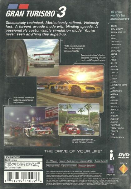 ome say there's nothing finer than a well-crafted automobile. But with over 150 of the world's top performing sports cars, luxury autos, modified street runners, rally racers, and prototype evolutionary automobiles, the finer driving experience may be in Gran Turismo™ 3: A-spec. The flawless third edition of the racing series that is studied by all other racing game designers creates a new paragon of graphic and handling distinction. Recreating racing excellence to the last detail of physics and automotive engineering with the assistance of the manufacturers such as Aston Martin, Lotus, Nissan, and Ford Motors, the evolution of racing realism is unmatched by any other game. And with undeniably stunning visuals set in glinting cityscapes and on swirling rally tracks, no game approaches its beauty. Come around a corner at dusk, and blinding sunlight will blaze across your windshield. Whip through country roads and marvel as the reflection of nearby trees gleams off of your sedan. Skid across slick wet roads and watch the spray of your wake douse your opponent in a wall of mist. From the perfect lines of real automobiles settling on their shocks to unprecedented effects only possible with the PlayStation 2, this is the pinnacle of racing.