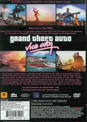 Having just made it back onto the streets of Liberty City after a long stretch in maximum security, Tommy Vercetti is sent to Vice City by his old boss, Sonny Forelli. They were understandably nervous about his re-appearance in Liberty City, so a trip down south seemed like a good idea. But all does not go smoothly upon his arrival in the glamorous, hedonistic metropolis of Vice City. He's set up and is left with no money and no merchandise. Sonny wants his money back, but the biker gangs, Cuban gangsters, and corrupt politicians stand in his way. Most of Vice City seems to want Tommy dead. His only answer is to fight back and take over the city himself.
