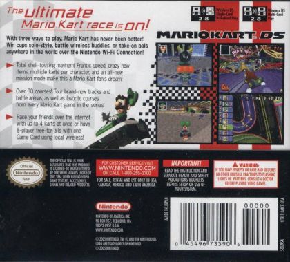 Time to race...no wires attached. The acclaimed Mario Kart series has gone wireless, letting players race and battle with up to eight karts at once, regardless of whether everyone has a game card. An all-star cast that includes Mario, Luigi, Peach, Yoshi, Donkey Kong, Wario, Bowser and Toad will round out a truly all-star lineup of more than 30 courses drawn from every Mario Kart game. That's right – players will tour courses from Super Mario Kart, Mario Kart 64, Mario Kart: Super Circuit and Mario Kart: Double Dash!! , not to mention brand-new tracks and arenas. With all the crazy items and frantic speed players have come to expect, this game is a Mario Kart fan's dream. The game has a new dimension of fun, since players can battle others around the world by connecting to Nintendo's new wireless gaming service, Nintendo Wi-Fi Connection, via Wi-Fi.