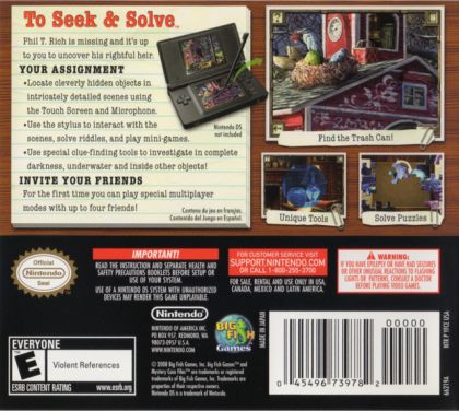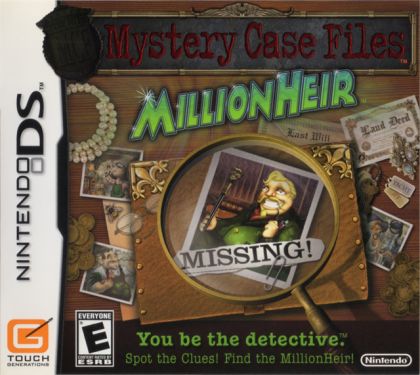 Players seek out cleverly hidden items in a multitude of painted scenes. Players progress through an interactive detective story investigating a cast of characters and uncovering new evidence to find the rightful heir to a million-dollar fortune. This new portable installment is available only for Nintendo DS. With interactive logic puzzles that use both the touch-screen interface and built-in microphone and include the first ever multiplayer mode for a Mystery Case Files game, Mystery Case Files: MillionHeir presents a new generation of seek-and-solve games for casual gamers and franchise fans.