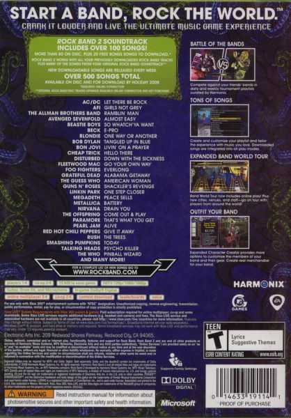 The Rock Band 2 soundtrack will feature over 100 songs with over 80 songs on disc plus an additional 20 bonus tracks which will be made available for free download this fall. This builds upon the unparalleled depth and diversity of Rock Band's original set list and its ever-expanding library of downloadable tracks. Comprised entirely of master recordings from some of rock's most prolific and untouchable artists, including AC/DC, Guns N' Roses, Bob Dylan, Metallica, Pearl Jam and more, Rock Band 2 will deliver the most impressive and largest music catalogue of any music-based videogame ever.