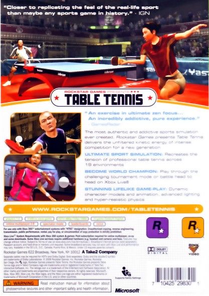 No guns, no violence, just straight up ping pong from the studio that brought us such games as Midnight Club and Red Dead Revolver. Rockstar San Diego's game takes advantage of the Xbox 360's graphic power and technology to capture the intensity, speed and excitement of Table Tennis.