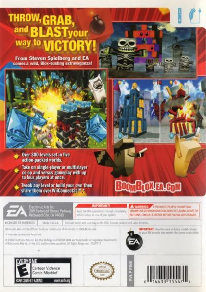 Fun for kids and the entire family, BOOM BLOX offers action-packed interactive activities that takes Wii play to a new level of creativity and fun with single player, co-op, and versus gameplay. Explore the visceral gameplayperfectly suited for the Wii's interactivitythat keeps you destroying your way through brain-twisting challenges. Interact with entertaining characters such as the Blox-laying chickens or the baseball throwing monkeys, who bring personality to the Tiki, Medieval, Frontier, and Haunted themed environments. Additionally, remix any level of the game in Create Mode using props, blocks, or characters that have been unlocked during the game. You can virtually build anything you can dream up. Plus, your designs can then be shared with friends or used to challenge others to solve your newly created puzzle via WiiConnect24.