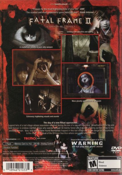 This time the terrifying journey takes the player to a whole new creepy setting, an abandoned village, where they play the role of Mio Amakura, a young girl who is gifted with a strong sixth sense. The story follows the horrifying journey of Mio and her twin sister, Mayu, as this lost village and a strange, symbolic crimson butterfly create the spooky setting for yet another frightening tale in Fatal Frame 2.
