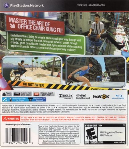 Kung Fu Rider sends players on a wild ride through the busy streets of Hong Kong. Taking on the role of private detective Toby or his assistant Karin, players find themselves on the outs with the mob. When Toby and Karin are confronted by mobsters at their detective agency, players have no choice but to grab their office chairs, hold on tight and slide through the streets in order to make a daring escape. Utilizing the PlayStation Move motion controller, players must steer, jump, dash and power dash through the city while avoiding obstacles and evading attacks in this comical and fast-paced action arcade game.