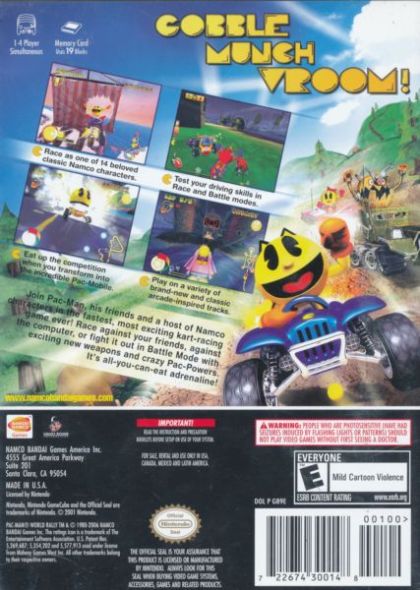 Pac-Man World Rally puts players behind the wheel as Pac-Man or one of 14 other classic characters from the worlds of "Pac-Man" and other popular Namco franchises, racing for the checkered flag while using unique power-ups and items to prevent their opponents from claiming victory. Across the game's many colorful and iconic levels, players will utilize a unique power sliding mechanic that allows them to skid around tight corners without losing speed, while charging up Boost Bottles they can use at will to leave their opponents in their dust. And because it's Pac-Man, players can expect to see him do what he does best: gobble up his adversaries along with all the Pac-Dots in sight. Players will be able to collect Power Pellets during a race to unleash a special ability that will allow them to take a bite out of their opponents and turn the tables on even the most lopsided races.
