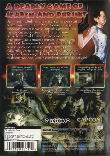Resident Evil: Dead Aim sees search and pursuit team agent, Bruce MacGavin spear heading a shady anti-Umbrella organization's attempt to infiltrate and investigate a gigantic sea-cruiser as it makes its way across the Atlantic. Bruce MacGavin is a brand new character to the Resident Evil series and along with his mysterious female partner must battle against the hoards of relentless zombies that confront them for the first time.