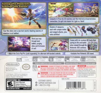 One of the most beloved franchises in Nintendo's long history makes its glorious return in spectacular 3D. Pit of Kid Icarus fame is back in a new game designed specifically for the Nintendo 3DS system by Masahiro Sakurai, creator of the Kirby and Super Smash Bros. franchises, and his development team at Project Sora. Kid Icarus: Uprising is a fast-paced and actionpacked blend of aerial and ground-based shooting built on elegantly intuitive and streamlined play control. This follow-up to the original Kid Icarus - released for the Nintendo Entertainment System in 1987 - has been at the top of gamers' wish lists for years.