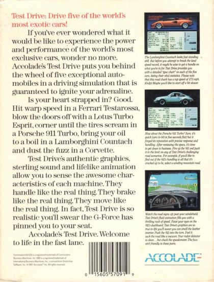 Test Drive's authentic graphics, sterling sound and lifelike animation allow you to sense the awesome characteristics of each machine. They handle like the real thing. They brake like the real thing. They move like the real thing. In fact, Test Drive is so realistic you'll swear the G-Force has pinned you to your seat.