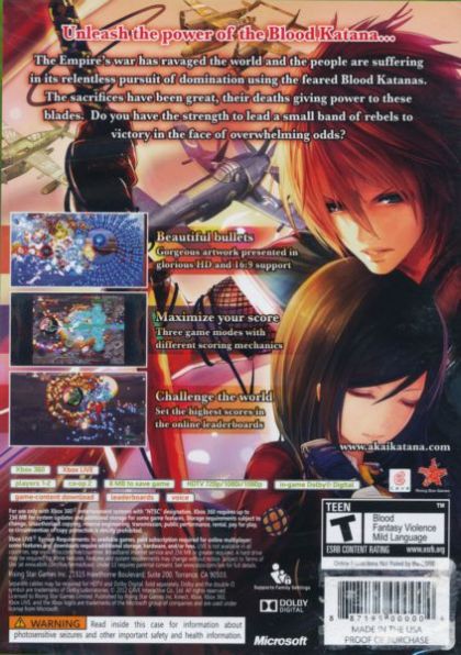 Created specifically with the Xbox 360 in mind, Akai Katana has new stages, new characters and a new scoring system. The graphics are adapted to suit 16:9 screens and everything is even more beautiful with full HD artwork.