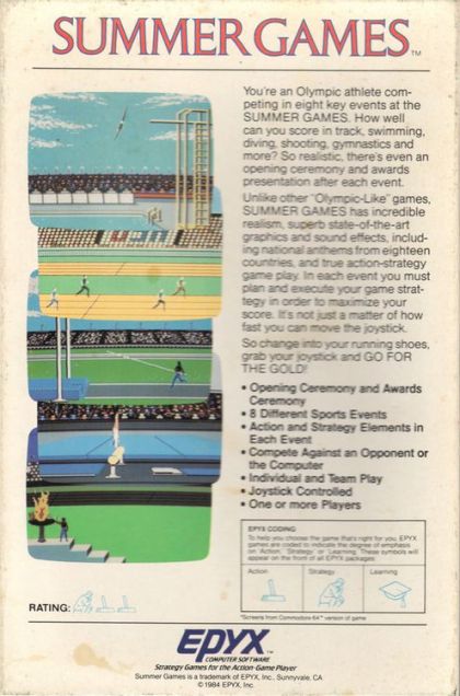 The ceremonial flame is lit, the pigeons released... the Summer Games have officially begun! Athletes from eight different nations are gathered here to display their various talents. You have the chance to outshine them all. Compete in swimming, diving, and track and field events. Choose a nation to represent and go for the Golden Medal, or even a new world record!