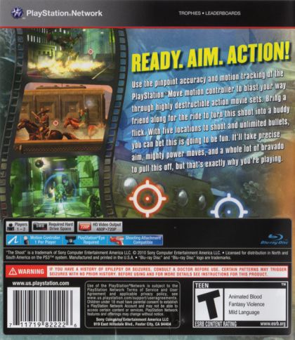 The Shoot is a first-person oriented shooter game for PlayStation 3 that uses the PlayStation Move controller and the PlayStation Eye peripheral to create a unique motion-controlled arcade gaming experience. Set amidst a movie-themed game setting, players use a single PlayStation Move controller to target appropriately movie-themed enemies and to interact with the gameworld, while the PlayStation Eye camera monitors their location for enemies bent on returning fire of their own. Additional features include two-player support, 480p and 720p HD video support and more.