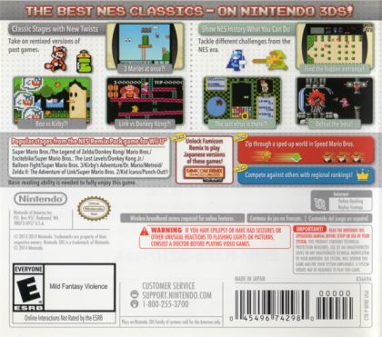 Take on a rapid-fire onslaught of challenges and mash-ups from 16 of Nintendo's finest 8-bit games! Test your skills on a gauntlet of quick, tricky challenges and remix stages that combine parts of different games. The best mix of titles from the NES Remix and NES Remix 2 games is on Nintendo 3DS. Now you're playing with PORTABLE power! Link vs. Donkey Kong! Kirby vs. Boo! It's mash-up mania in this celebration of all things NES! Race through to earn stars on increasingly tough tasks, like beating Ridley from Metroid or making Princess Peach save herself! Compete in Championship Mode's blitz of challenges from the Super Mario Bros., Super Mario Bros. 3, and Dr. Mario.