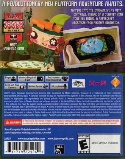 Embark on your own unique adventure through a vibrant papercraft world that you hold in the palm of your hand. Tearaway for PlayStation®Vita is the next creative masterpiece from Media Molecule, the critically acclaimed developer behind the award winning LittleBigPlanet franchise. Inspired by and created specifically for PS Vita, the tactile world of Tearaway is a beautifully crafted 3D open environment built completely out of paper that behaves with the real world physics of actual paper material brought magically to life.