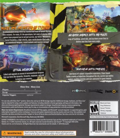 2027. Sunset City. A contaminated energy drink has transformed most of the population into a multitude of toxic mutants. For many it's the end of the world, but for you it's a dream come true. Your old boss? Dead. Your boring job? Gone. Transform the open-world into your tactical playground by grinding, vaulting and wall-running across the city while using a devastating, unconventional arsenal. With hyper-agility, unique weapons, and customizable special abilities, "Sunset Overdrive" rewrites the rules of traditional shooters and delivers an explosive, irreverent, stylish, and totally unique adventure exclusively to Xbox One.