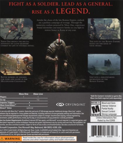 Developed exclusively for Xbox One by renowned studio Crytek, "Ryse: Son of Rome" is an immersive action-adventure story of struggle, brutality and heroism. It follows a fearless Roman soldier named Marius Titus who joins the army to avenge the slaying of his family and emerges as a hero who must fight to save the Roman Empire. <br /><br /> "Ryse: Son of Rome" presents a cinematic re-creation of the Roman Empire, its people, conflicts and landscapes in breathtaking detail that represents the graphical benchmark for the next console generation. It brings the brutality and intensity of Roman warfare to life in visceral detail, thrusting you into the chaos of close-quarters combat, where the emotion on the enemy's face can be seen and felt. <br /><br /> Showcasing the possibilities of Xbox One, "Ryse: Son of Rome" extends the gameplay experience with unique features such as Xbox SmartGlass, Game DVR and the new high-fidelity Kinect, letting you manage your character's progress with your compatible mobile or tablet device, record and share your best gameplay moments with friends, and command legions with the sound of your voice. <br /><br /> <ul> <li><b>A riveting story of Roman revenge:</b> "Ryse: Son of Rome" tells the story of the young Roman soldier Marius Titus who witnesses the murder of his family at the hands of barbarian bandits. Seeking revenge, he travels with the Roman army to Britannia where he proves himself a soldier of phenomenal skill and quickly rises through the ranks. As Marius leads the army against the barbarian horde, his quest unravels and he discovers that he must return to Rome to find his vengeance.</li> <li><b>Next-generation cinematic immersion:</b> With the power of Xbox One, "Ryse: Son of Rome" presents conflict in the Roman Empire like you've never seen it before, from the northern reaches of Britannia to the Coliseum and the very heart of Rome. New advancements in performance capture allow you to interact with believably realistic characters featuring incredibly detailed facial animation and naturalistic emotion.</li> <li><b>Brutally intense combat:</b> "Ryse: Son of Rome" delivers a visceral, brutally realistic combat experience with epic-scale battles and breathtaking visuals that will set the standard for next-generation action games. Relive the ruthless history of ancient Rome as you engage in raw close-quarters combat against the barbarian horde, utilizing both sword and shield as weapons to attack, counter, block and pull off brutal executions.</li> <li><b>Epic-scale Roman warfare:</b> Experience the thrill of Roman combat as you charge into massive battlefields filled with more than 100 characters on screen at the same time, each with individually controlled AI. Unmatched intensity and realism enhanced with stunning detail combine to deliver an incredibly immersive action experience.</li> <li><b>Cooperative gladiatorial combat in the Coliseum:</b> The cooperative multiplayer experience in "Ryse: Son of Rome" plunges you into the brutal world of gladiatorial combat, where you enter the Coliseum to fight side-by-side with your friends against an ever-changing array of enemies, to the roar of thousands of spectators.2</li> <li><b>Kinect integration and battle formations:</b> Command legions using the all-new, high-fidelity Kinect. With the power of your voice you can command your surrounding units in battle in a strategic way to help defeat your foes, fire pilums or arrows, or block incoming attacks.</li> <li><b>Inventive SmartGlass features:</b> "Ryse: Son of Rome" incorporates deep SmartGlass integration that extends the gameplay experience to compatible mobile and tablet devices.</li> </ul>