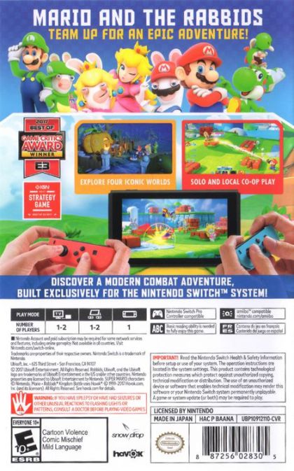 The Mushroom Kingdom has been torn apart by a mysterious vortex, transporting the Rabbids into the once-peaceful area, splintering this beloved land. To bring order back to the Kingdom, Mario, Luigi, Princess Peach, and Yoshi team up with Rabbids heroes in a journey through four different worlds.