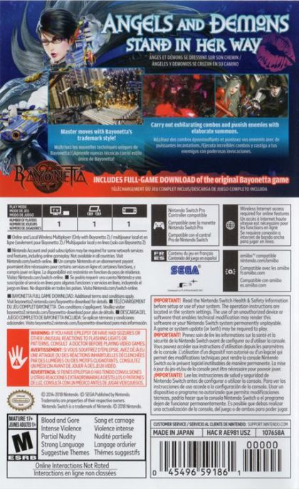 Bayonetta 2 includes Bayonetta 2 on a Nintendo Switch game card and a download code for Bayonetta*
