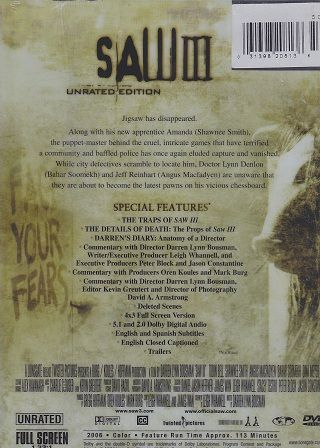 After eluding the cops, psychopathic killer Jigsaw turns an abandoned warehouse on the edge of town into a gruesome torture chamber in this third installment of the horror series. His new protégée Amanda kidnaps a doctor who's forced to keep the evil master alive. Barely clinging to life, Jigsaw begins to carry out his grotesque plans for the lady doc and another helpless victim.