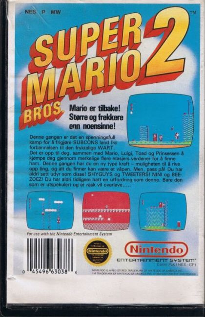 Mario's back! Bigger and badder than ever before! This time it's a fierce action-packed battle to free the land of Subcon from the curse of the evil Wart. It's up to you, along with Mario, Luigi, Toad and the Princess, to fight your way through bizarre multi-level worlds and find him! This time you've got a brand new kind of power - plucking power - and now anything you find can be a weapon. But beware! You've never seen creatures like these! Shyguys and Tweeters! Ninji and Beezos! And you've never had an adventure like this! Only cunning and speed can save you now...