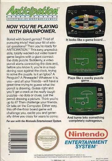 Bored with board games? Tired of pursuing trivia? Had your fill of ethical questions? Then you're ready for ANTICIPATION. This zany, unpredictable, totally wacked-out video board game begins with a giant connect-the-dots puzzle. Suddenly, a video pencil starts connecting the dots and, before you know it, you're in a maddening race against the clock, trying to solve the puzzle. Is it an Igloo? A Penguin? A Pineapple? Whatever it is, you-and all your friends-will have a great time trying to guess what the pencil is drawing. Guess right and you'll get a crack at the really tough puzzles-no dots or clues, just the pencil drawing a picture. Think you're up to it? Then challenge your friends. Or take on the Computer. Either way, this off-the-floor board game will challenge you, excite you and generally drive you crazy for years to come.