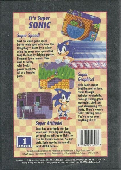 Super Speed! Bust the video game speed barrier wide open with Sonic the Hedgehog. Blaze by in a blur using the super sonic spin attack. Loop the loop by defying gravity. Plummet down tunnels. Then dash to safety with Sonic's power sneakers. All at a frenzied pace. Super Graphics! Help Sonic escape bubbling molten lava. Swim through turbulent waterfalls. Scale glistening green mountains. And soar past shimmering city lights. There's even a 360 degree rotating maze. You've never seen anything like it. Supper Attitude! Sonic has an attitude that just won't quit. He's flip and funny, yet tough as nails as he fights to free his friends from evil. So just wait. Sonic may be the world's next SUPER hero...