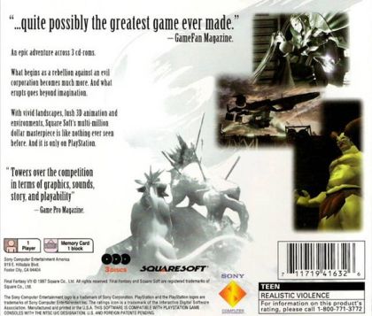 Featuring seamless 3D gameplay and animation, Final Fantasy VII contains hundreds of pre-rendered, computer-generated backgrounds and features real-time battles, vast map screens, and a complex and engrossing storyline. Published on three CDs, Final Fantasy VII will be one of the largest and most richly detailed gaming experiences ever created.