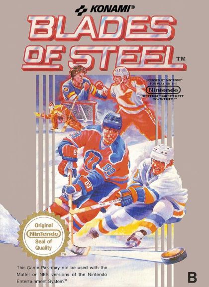 Fight for victory in the hottest hockey game on ice! With sharpened blades and a lethal stick, you slash into a rink surrounded by thousands of screaming fans. It's time for full-speed, high contact hockey, the kind of bone-jarring action played by the pros. The puck is dropped, you take control, center it and... Whoa! Your opponent viciously checks you from behind, making an incredible steal. You charge after him, crushing him against the boards. Suddenly tempers flare, off come the gloves, and you're swinging fists like a prize fighter. What action! You can even rack up assists like the great you-know-who. Or play goalie in the slap shooting penalty scenes. So strap on Blades of Steel. And imagine those immortal words - "He shoots, he scores!"