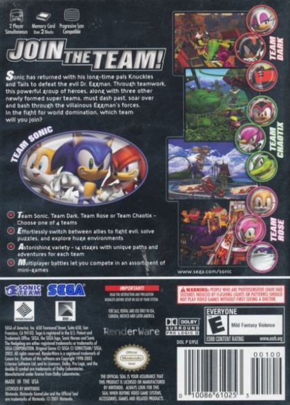 SEGA's legendary mascot Sonic The Hedgehog makes his historic multi-platform debut and embarks on his biggest adventure ever, with his trademark blazing speed and a new gameplay twist in "Sonic Heroes." Sonic and his friends have evolved, adopting a configuration feature that lets gamers control three playable characters simultaneously, using Sonic's speed, Knuckles' power, and Tails' ability to fly, to conquer massive worlds. This team-based gameplay marks the next evolution in Sonic's gaming career, taking platform gaming to a completely new level. Using the three formations and the powerful moves that each team member has, Sonic and his friends combine forces to battle the ultimate evil.
