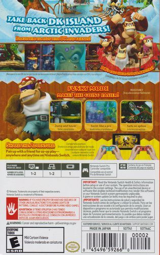 Join Donkey Kong, Diddy Kong, Dixie Kong, Cranky Kong and Funky Kong as they swim, swing, spring and surf through islands packed with hazards, hidden collectibles, and unforgettable boss encounters! Use each character's unique moves to explore every corner of each island, unearth special items and even hidden exits.