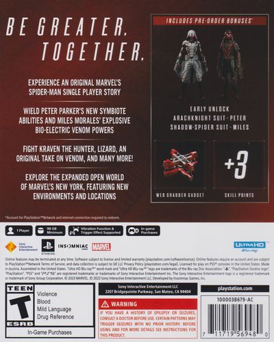 Peter Parker and Miles Morales, return for an exciting new adventure in the critically acclaimed Marvel's Spider-Man franchise. Swing, jump and utilize the new Web Wings to travel across Marvel's New York, quickly switching between Peter Parker and Miles Morales to experience different stories and epic new powers, as the iconic villain Venom threatens to destroy their lives, their city and the ones they love.