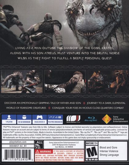 A difficult and unfamiliar road awaits as you explore a stunning retelling of a classic story. Join Kratos as he adventures through a deep and reflective journey of growth, violence and the desire to become a better man for the sake of his son. In a world of monsters, dragons and gods, the weight of responsibility rests heavy on your shoulders – and when your life is filled with blood and chaos, how can you prevent the mistakes of the past in order to protect your future?
