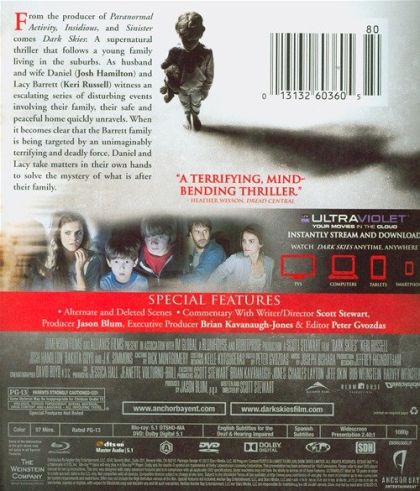 From the producers of Paranormal Activity, Insidious, and Sinister comes Dark Skies: a supernatural thriller that follows a young family living in the suburbs. As husband and wife Daniel and Lacey Barret witness an escalating series of disturbing events involving their family, their safe and peaceful home quickly unravels. When it becomes clear that the Barret family is being targeted by an unimaginably terrifying and deadly force, Daniel and Lacey take matters in their own hands to solve the mystery of what is after their family.