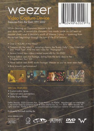 Weezer: Video Capture Device - Treasures From the Vault 1991-2002 contains every one of Weezer's music videos from that time period (including the classic Spike_Jonze directed clips for "The Sweater Song," and "Buddy Holly"). Also included are never-before-released videos, live footage from the beginning of the band's career, acoustic performances, and footage of the band at work in the studio.