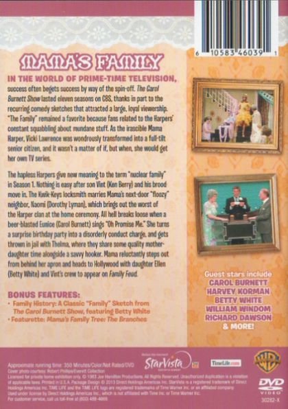 Mama's Family mined humor from a squabbling family in the Midwestern blue collar suburb of Raytown. The noisy clan was headed by Mama, a buxom, gray-haired widow with sharp opinions and a sharper tongue who shared her small house with her high-strung sister Fran, a journalist for a local paper. Mama's lazy, dimwitted son, Vint, a locksmith by trade, moved in at the start of the series with his troublesome teenage children, Buzz and Sonja, after his wife run off to become a Las Vegas show-girl. Much to Mama's disgust, Vint soon took up with the flirtatious neighbor Naomi. The two where married in early 1983, and Naomi moved in too. Further uproar was caused by the periodic visits from Mama's two married daughter's, the foul mouthed Eunice and the snobbish Ellen. Ed was Eunice's Dolt of a husband. In the Fall of 86 Mama's Family returned to TV in first-run syndication. Fran had recently passed (Rue McClanahan was now starring in The Golden Girls) and Ed and Eunice had moved to Flor