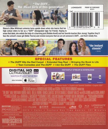 Bianca (Mae Whitman) is a content high school senior whose world is shattered when she learns the student body knows her as ‘The DUFF’ (Designated Ugly Fat Friend) to her prettier, more popular friends (Skyler Samuels & Bianca Santos). Now, despite the words of caution from her favorite teacher (Ken Jeong), she puts aside the potential distraction of her crush, Toby (Nick Eversman), and enlists Wesley (Robbie Amell), a slick but charming jock, to help reinvent herself. To save her senior year from turning into a total disaster, Bianca must find the confidence to overthrow the school’s ruthless label maker Madison (Bella Thorne) and remind everyone that no matter what people look or act like, we are all someone’s DUFF.